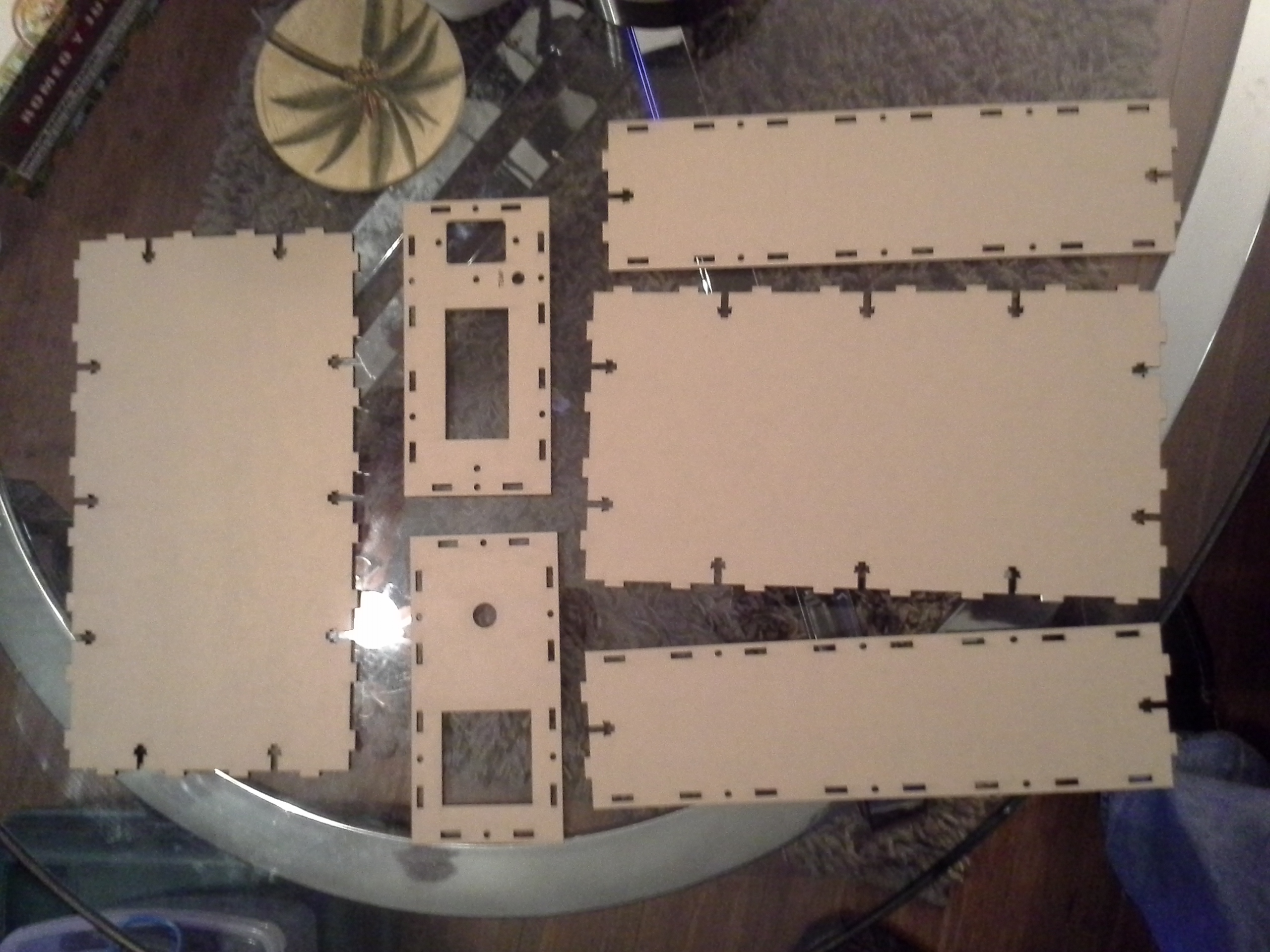 If I had to do it over again, I would make the whole thing out of P1 sheets of acrylic, reducing cost and giving the enclosure a more cubic form. I also selected the cheapest acrylic (3 mm thick), which is slightly regrettable because there is too much flex at the centers of the top and bottom acrylic panels for my liking.